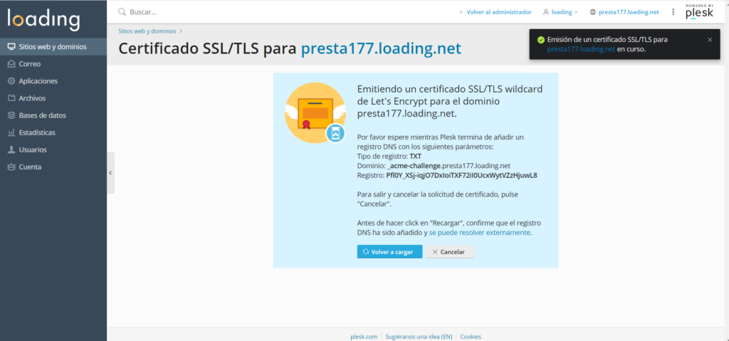 7. Una vez finalizado el proceso, recibirás una confirmación de que el certificado SSL se ha instalado correctamente en tu dominio.